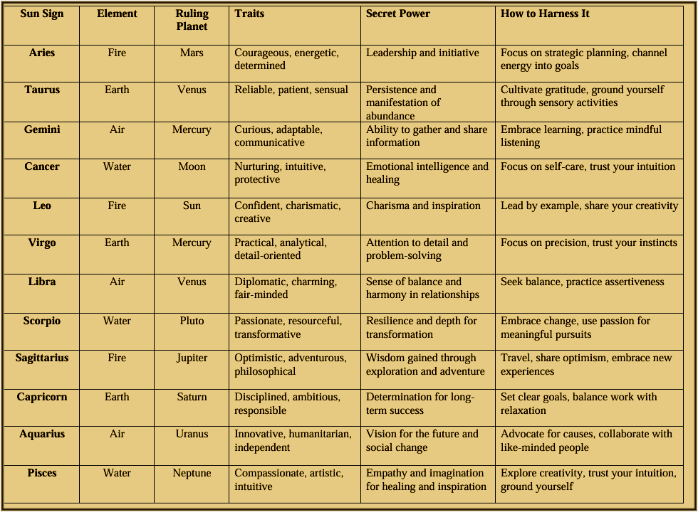 Here’s a table summarizing the power and secrets of each Sun sign: